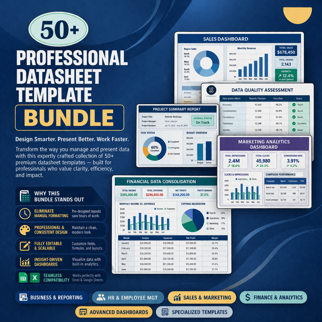 Upgrade your data management and reporting workflow with this 50+ Professional Datasheet Template Bundle designed for businesses, analysts, HR teams, and project managers.