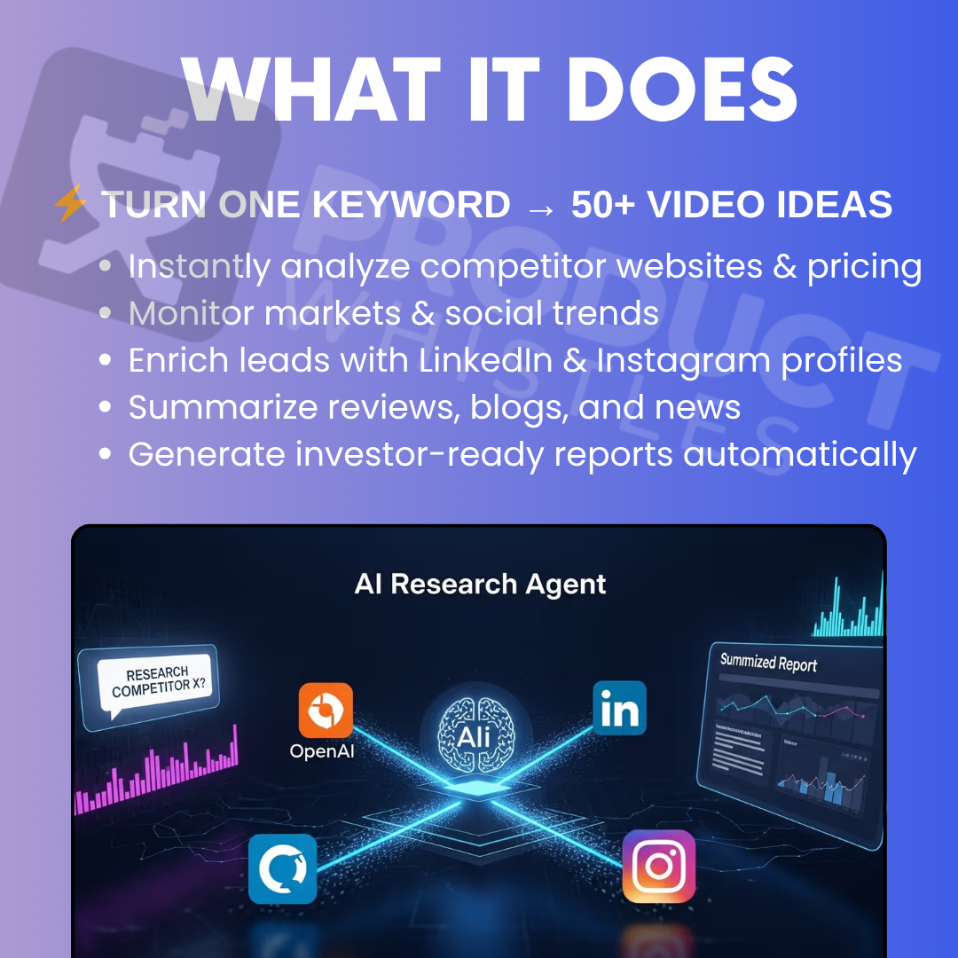 Stop wasting hours on manual research. This AI-powered research agent instantly transforms your chat messages into comprehensive market reports, competitor breakdowns, and social trend analysis. Perfect for entrepreneurs, marketers, investors, and sales professionals who need fast, reliable insights.