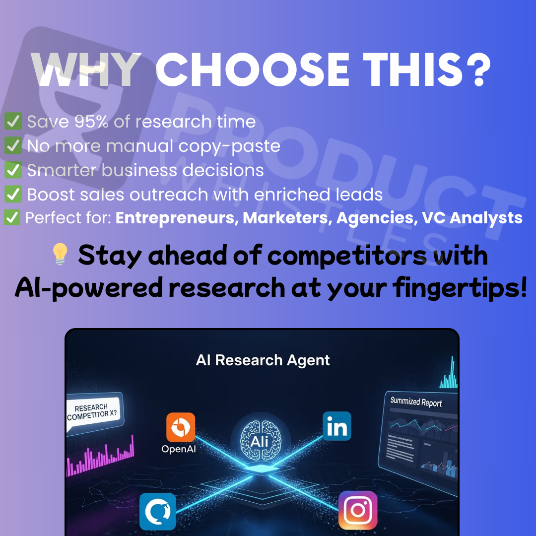 ✅ Make smarter business moves in minutes, not days. This AI Research & Competitor Analysis Agent is your secret weapon for staying ahead of the competition.