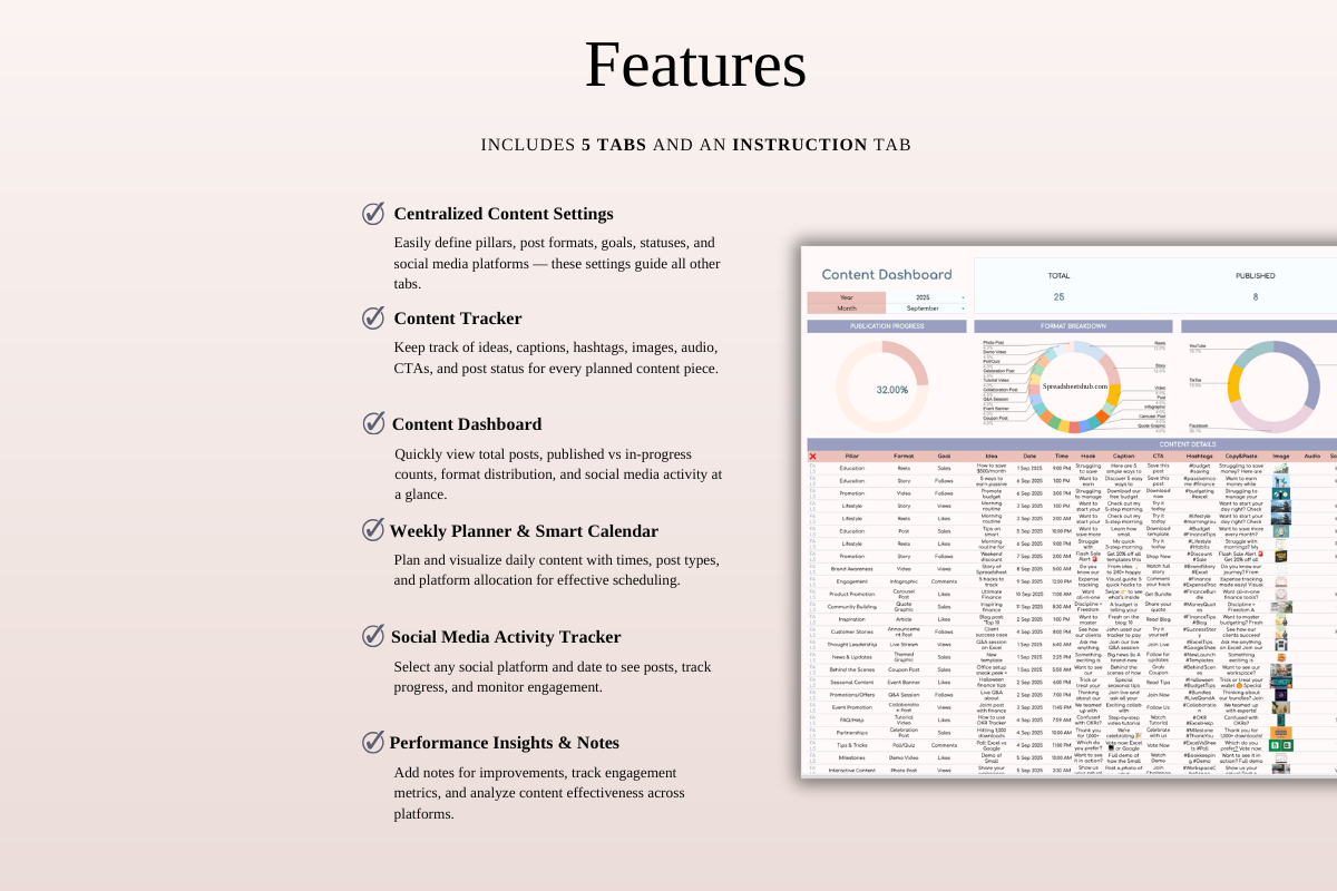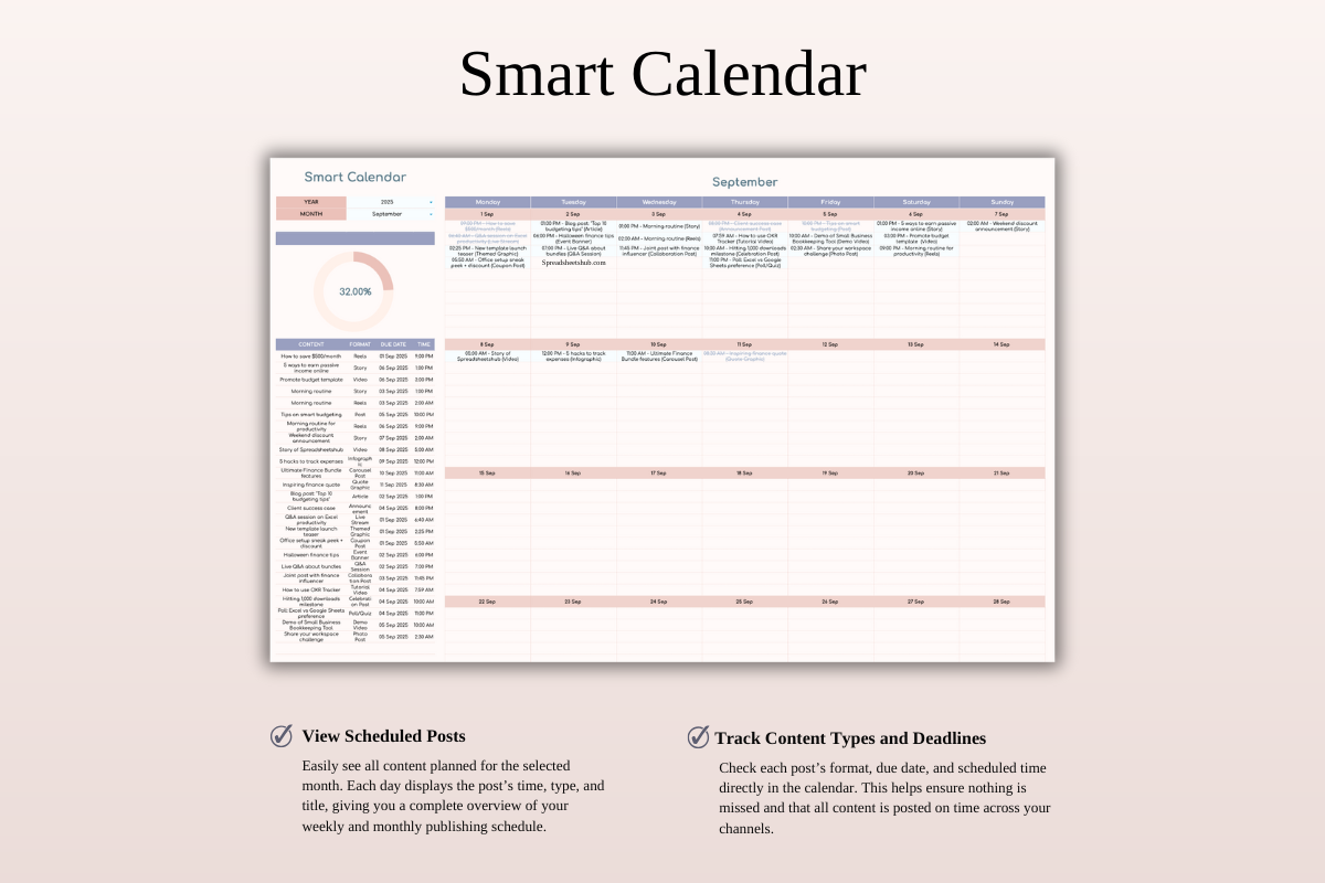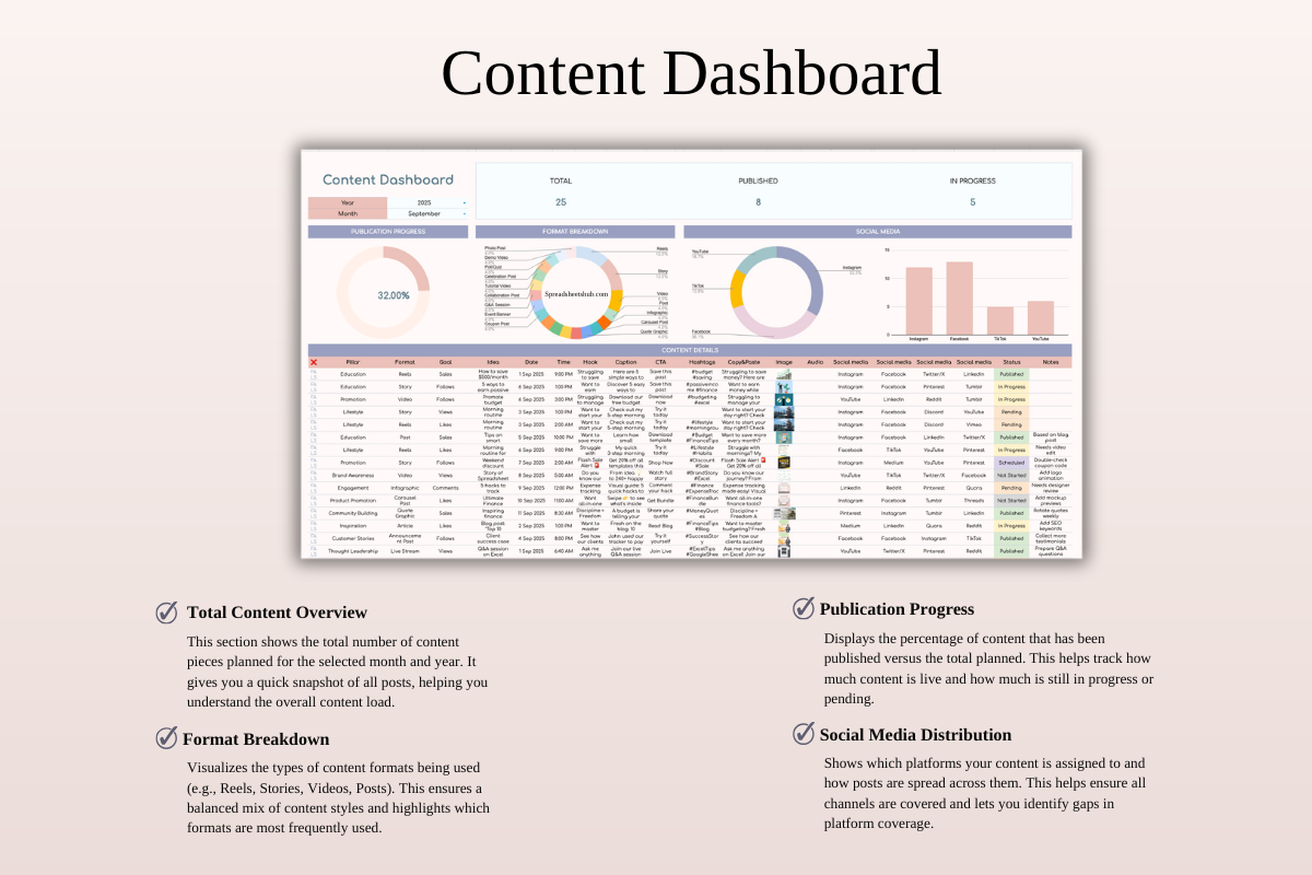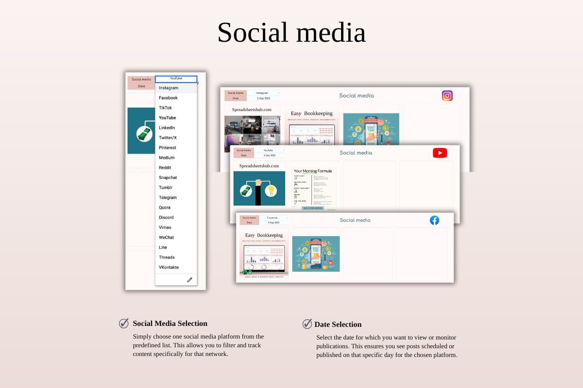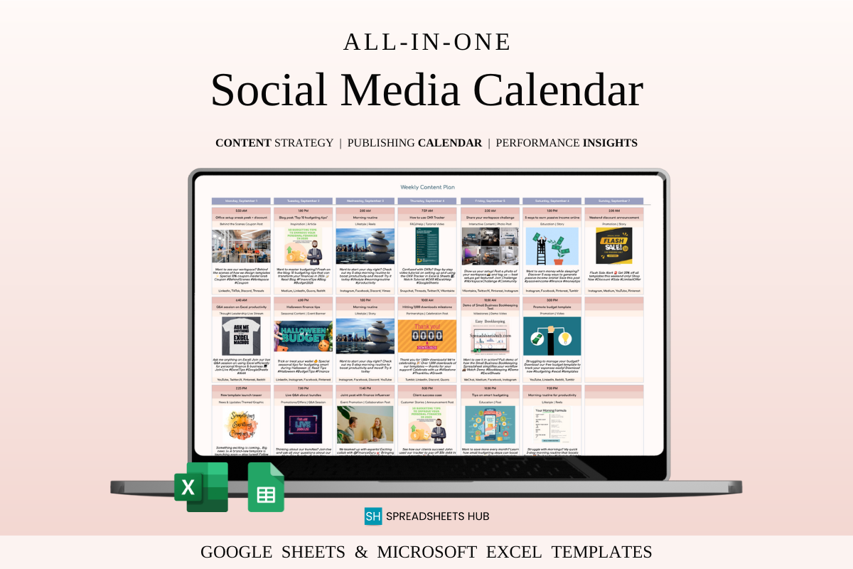 Managing social media doesn’t have to feel overwhelming. The Social Media Content Planner for Google Sheets & Excel is a clean, easy-to-use spreadsheet system designed to help you plan, organize, and track your content with clarity and consistency.
