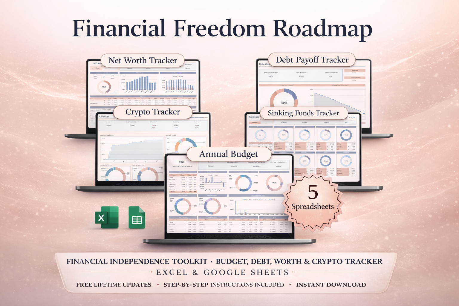 Financial Freedom Roadmap Spreadsheet | Financial Independence Toolkit | Budget, Debt, Net Worth & Crypto Tracker | Excel & Google Sheets