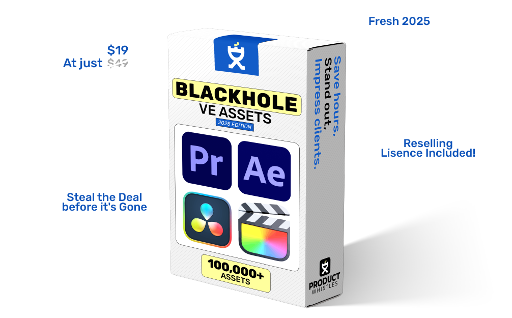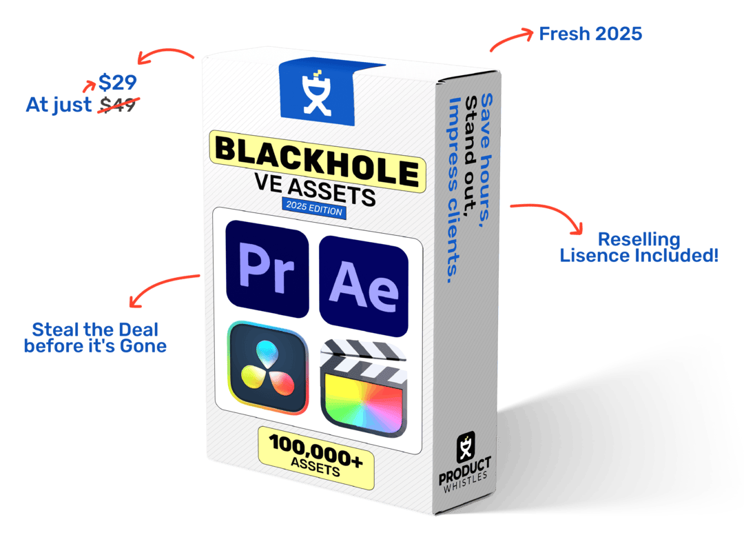 The bundle includes over 100 GB of assets, such as 8,000+ transitions, 2,000+ FX presets, 10,000+ fonts, 3,000+ sound effects, Adobe software, and a comprehensive video editing course.